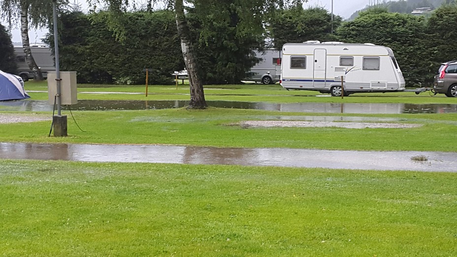Später kühlten wir uns im Freischwimmbad ab. Robin und Annika zeigten was sie alles im Schwimmkurs gelernt hatten. Der Wind wurde immer stärker, sodass wir wieder aus dem Bad mussten. Anschliessend spielten wir noch auf dem grossen Fussballplatz. Als es immer dunkler wurde und wir aus der Ferne das Donnern hörten, spazierten wir zurück zum Camper. Annika hatte bereits eine Freundin gefunden. Die 2 Girls spielten schön zusammen. Als es zu regnen anfing, flüchteten sie zu Emilia in den Wohnwagen. Das Nachtessen war fertig gekocht und der Regen lies nach. Wir holten Annika bei ihrer Freundin im Wohnwagen ab. Auf dem Campingplatz bildeten sich viele Pfützen.
