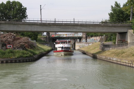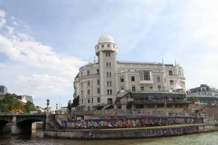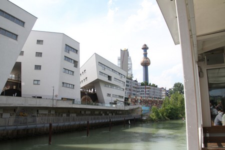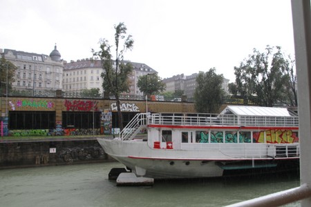Gestärkt vom PicNic suchten wir die nächste Hop on Hop off Haltestelle. Wir wollten zur Schifflände von City Cruise. Als wir auf dem Schiff waren, platzten die Wolken und es regnete wie aus Kübeln. Die Tour in der frisch renovierten MS Blue Danube präsentierte uns das moderne und historische Wien. In einer Schleifenfahrt befuhren wir den Donaukanal, im Mittelalter Hauptarm der Donau. Bedeutende Bauwerke zogen an uns vorbei: die Sternwarte Urania, das Hotel-und Geschäftsgebäude von Jean Nouvel, der Media Tower von Hans Hollein, das Schützenhaus von Otto Wagner und die Müllverbrennungsanlage Spittelau von Friedensreich Hunderwasser. Nach der Wendung Richtung Ausgangspunkt präsentierte sich das moderne Wien mit Graffiti-Kunstwerken und trendigen In-Lokalen.