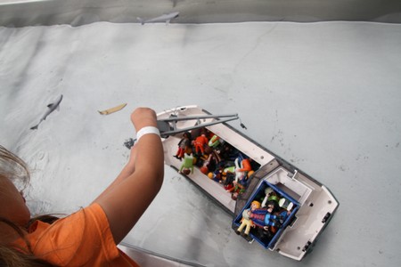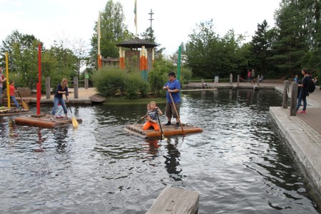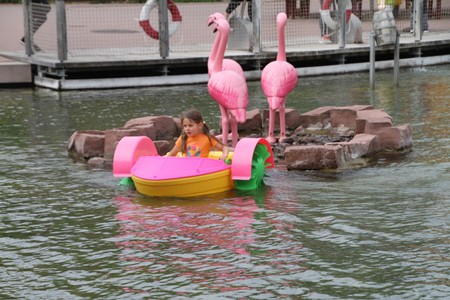 Die Kinder padelten auf dem See neben Flamingos und Pinguinen.