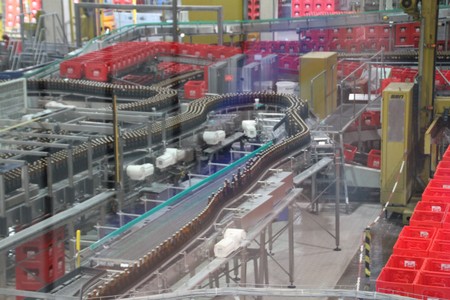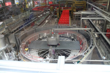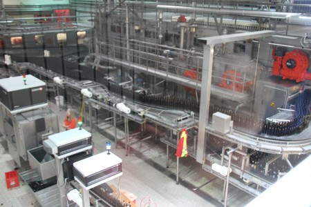 Die leeren Flaschen wurden in Harassen angeliefert und anschliessend gewaschen, kontrolliert und wieder befülllt. Pro Stunde wurden 30 000 Flaschen abgefüllt.