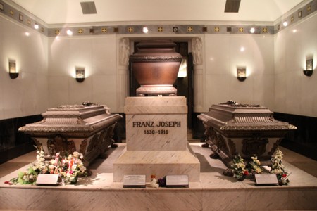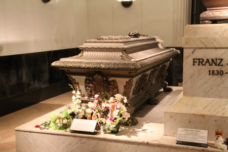 Die Särge von Franz Joseph und Sisi (mit Blumen geschmückt).