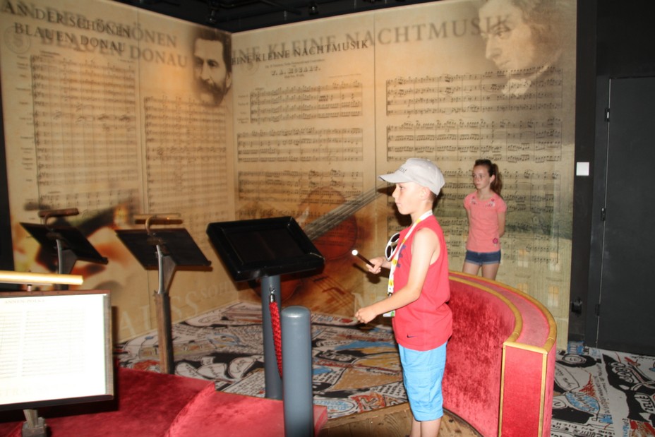 Das Haus der Musik hatte auch für die Kleinsten viel zu bieten: In eigenen Kinderbereichen konnten Annika und Robin Instrumente ausprobieren und mit verschiedenen Klängen experimentieren. Zum Abschluss durften sie sogar ein Orchester dirigieren.